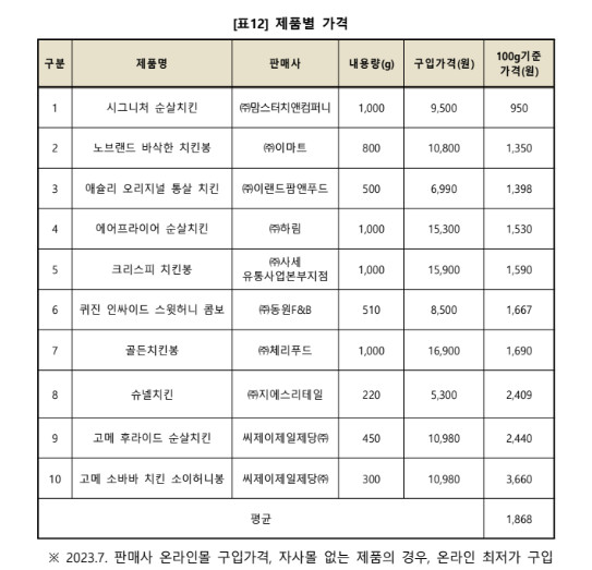 국산육을 사용하는 씨제이제일제당의 고메 소바바 치킨이 100g당 3660원으로 가장 비쌌습니다.