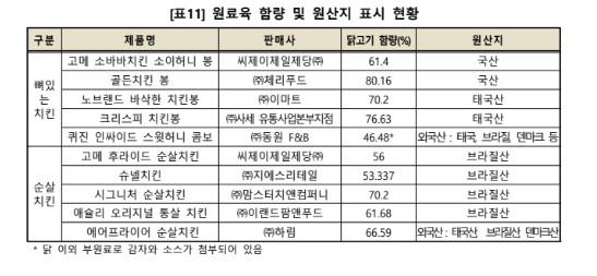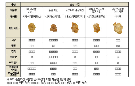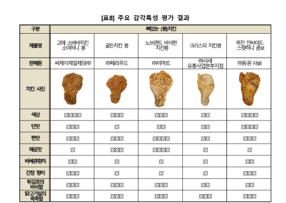 시험 제품은 뼈 있는 치킨(봉/날개) 5종과 순살치킨 5종 등 총 10개 제품입니다.