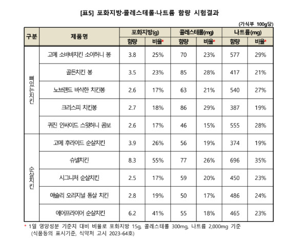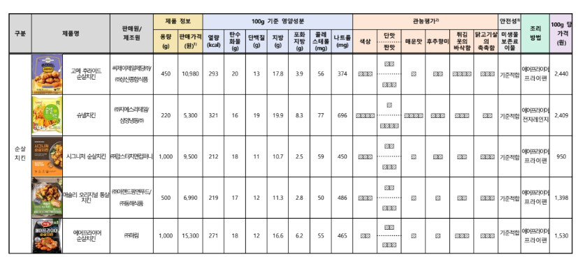 2개 제품은 '애슐리 오리지널 통살치킨(이랜드 팜 앤 푸드)'와 '에어프라이어 순살치킨(하림)'으로 나트륨과 콜레스테롤 함량 표시에 차이가 있어 품질관리 계획을 회신하였습니다.