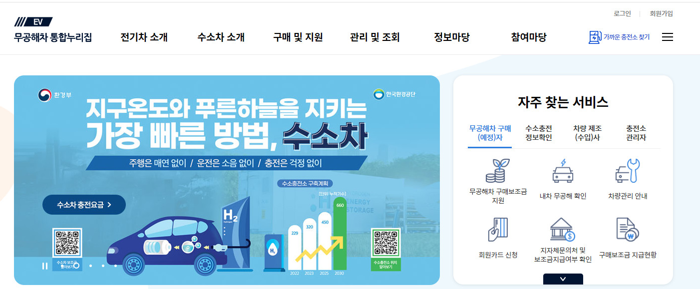 해당 사이트에 방문하시면 전기차/ 수소차 등 무공해차 구매보조금 지원, 내차 무공해 확인, 지자체 문의처 및 보조금 지급여부 등을 확인할 수 있습니다.