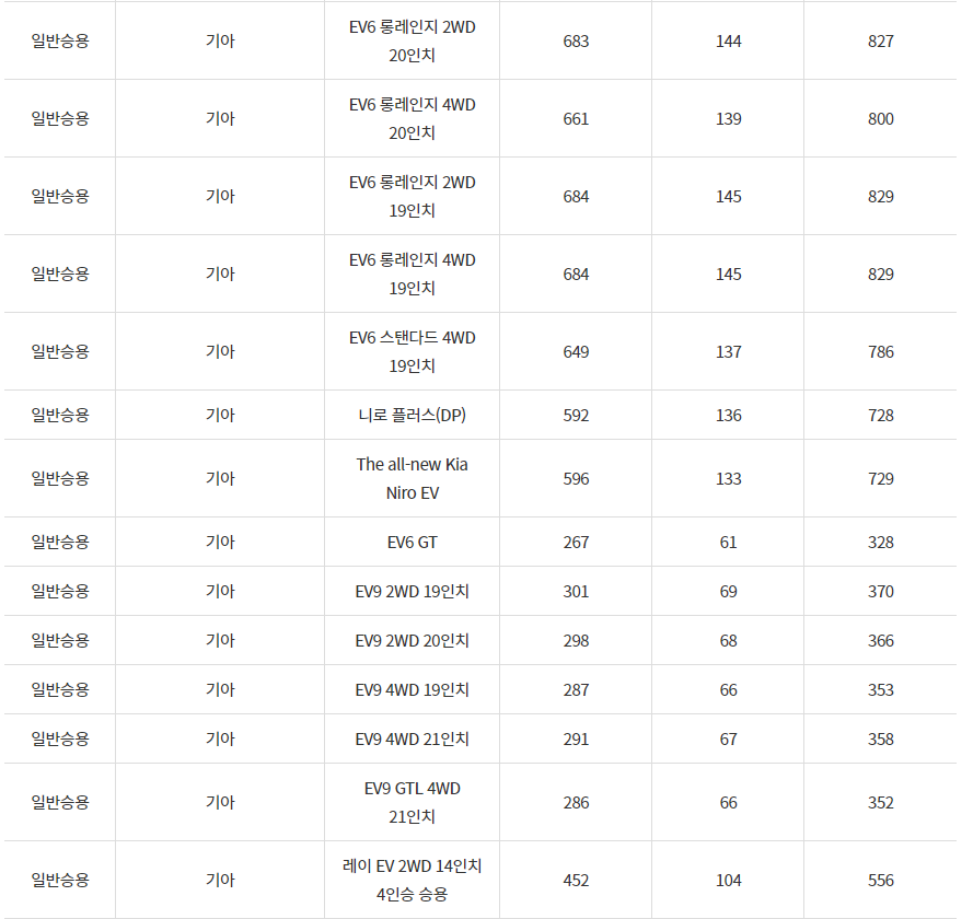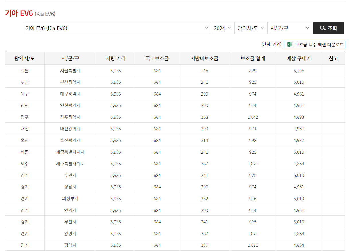 해당 사이트에서 기아 EV6의 차량별 보조금을 확인해 보았습니다.