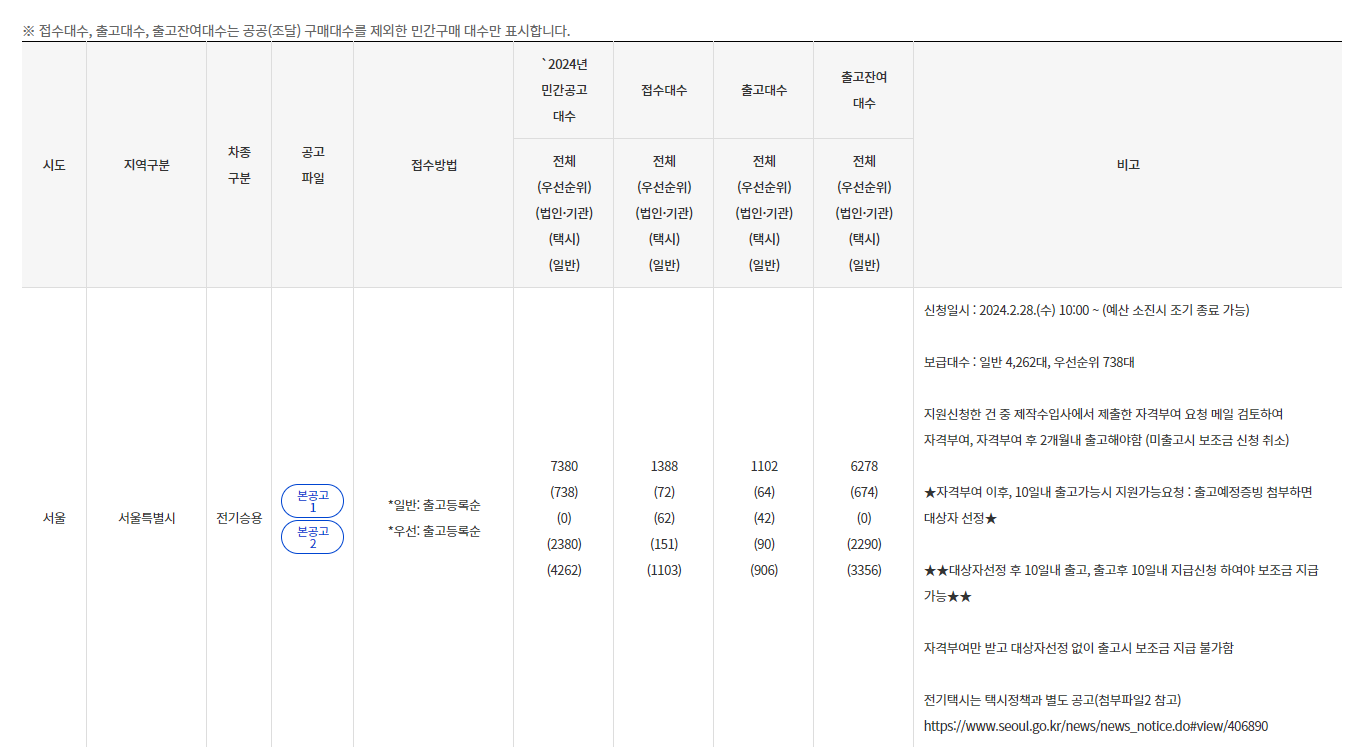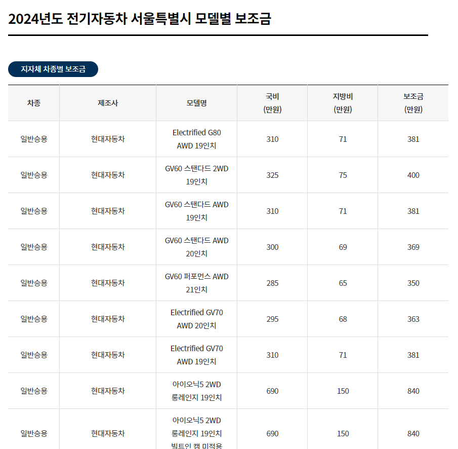 2024년 지자체별 자동차 모델별 보조금은 [무공해차 통합누리집 홈페이지]에서 확인가능합니다.